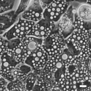 Microscopy image showing dozens of circular vacuoles derived from lysosomes.