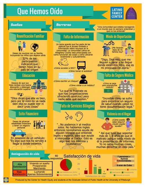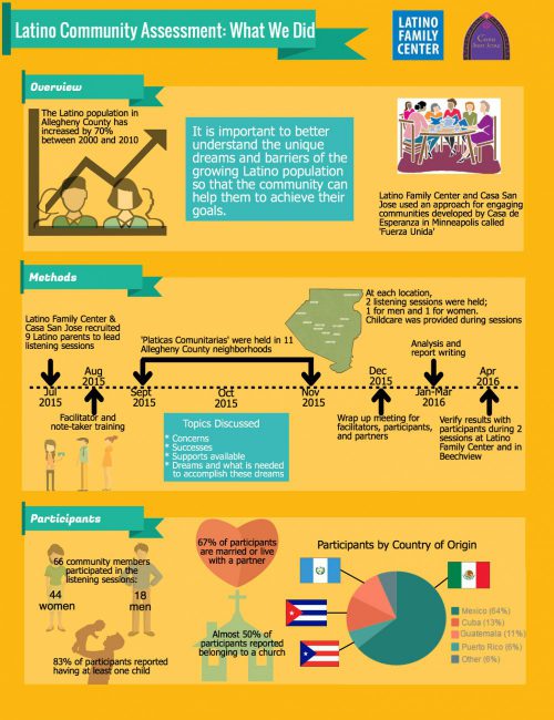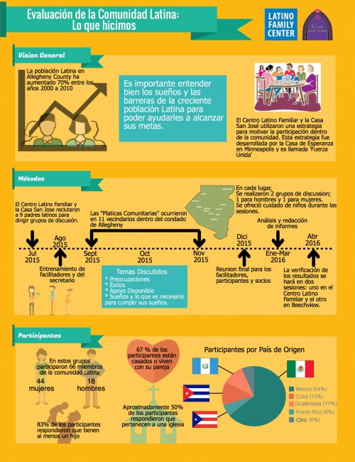 In the past year, a team of trained facilitators engaged 66 Latinos living in the Pittsburgh region in discussions covering their routines, concerns, successes, community support and dreams. The findings were transformed into detailed infographics, available in English and Spanish, to easily guide organizations and people who interact with Pittsburgh’s Latinos.