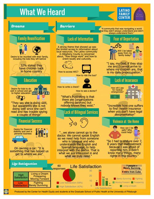 The University of Pittsburgh Graduate School of Public Health’s Center for Health Equity partnered with The Latino Family Center and Casa San Jose, the region’s two main service organizations that target Latinos, to seek a better understanding of the strengths and needs of this growing community. Such an assessment is necessary to identify the strategies and programs to best serve and learn from this diverse population.