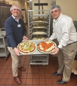 • At UPMC Shadyside, James Gray, project analyst, and Gabe Riberi, administrative fellow, crafted pizzas to fuel the cafeteria’s extended hours.